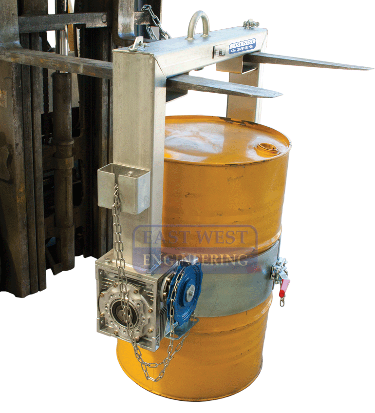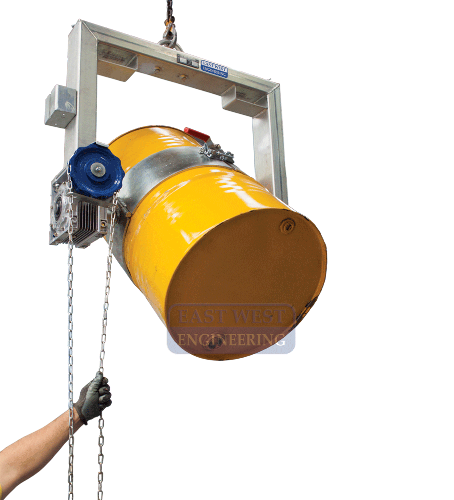 The DBR40C Drum Rotator is designed to lift and rotate a 205 litre steel drum 360° by overhead crane or forklift. Rotation of the drum is controlled throughout the operation by the chain driven gearbox which locks the drum in position when the operator stops pulling the chain, preventing dangerous and uncontrolled movements.