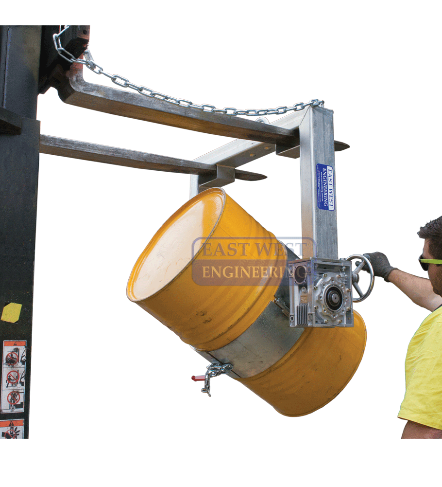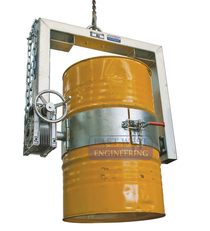 The DBR40H Drum Rotator is designed to lift and rotate a 205 litre steel drum 360° by overhead crane or forklift. Rotation of the drum is controlled throughout the operation by the handle driven gearbox which locks the drum in position when the operator stops turning the handle, preventing dangerous and uncontrolled movements.