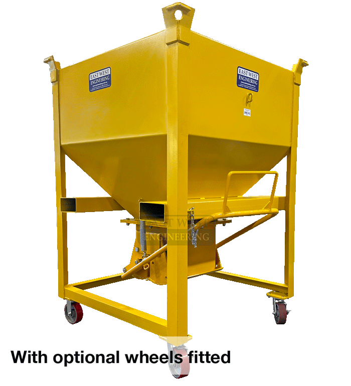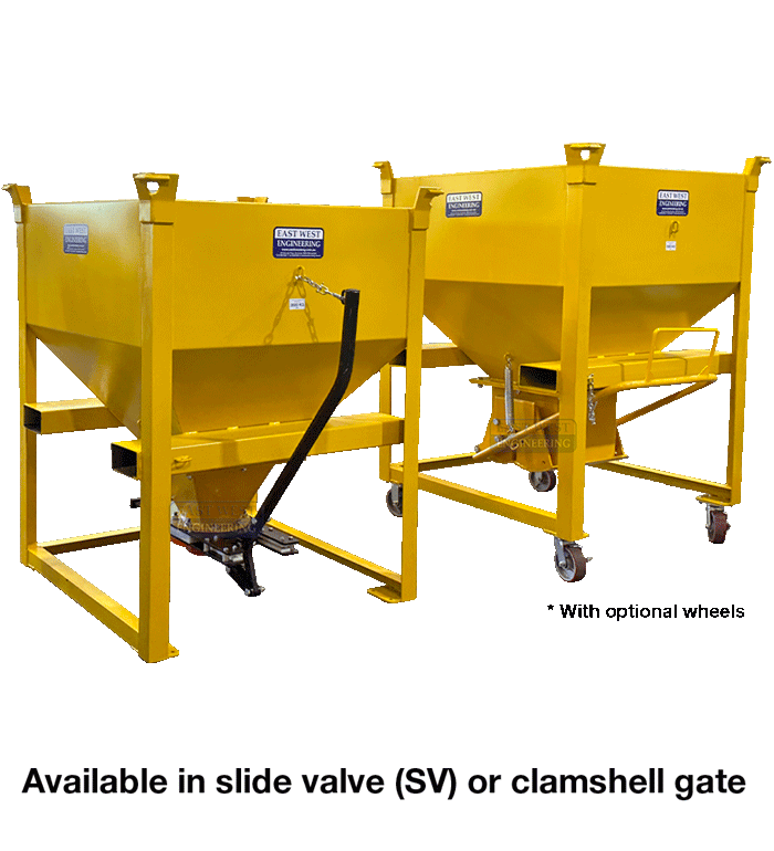 FEATURES: • Ideal for handling granular products such as aggregate, sand*, cement or grain • Easy to open and fast acting clamshell gate for positive shut-off of material flow • Crane lugs fitted for transporting fully loaded unit by overhead crane • Fitted with fork pockets to allow onsite transport by forklift • Stackable (2 high) in its standard configuration • Also available with 200mm dia slide valve (SV) for precise control of material flow • Optional wheel kit available on request • Raised stand (HBFSTAND-150), 1530mm height or can be made to suit requirements • Enamel paint finish