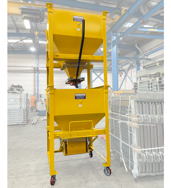 The HBF Hopper Bin is designed for the storage and dispensing of bulk materials with a clamshell opening mechanism for maximum material flow.