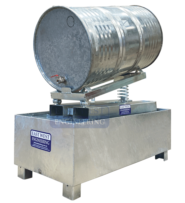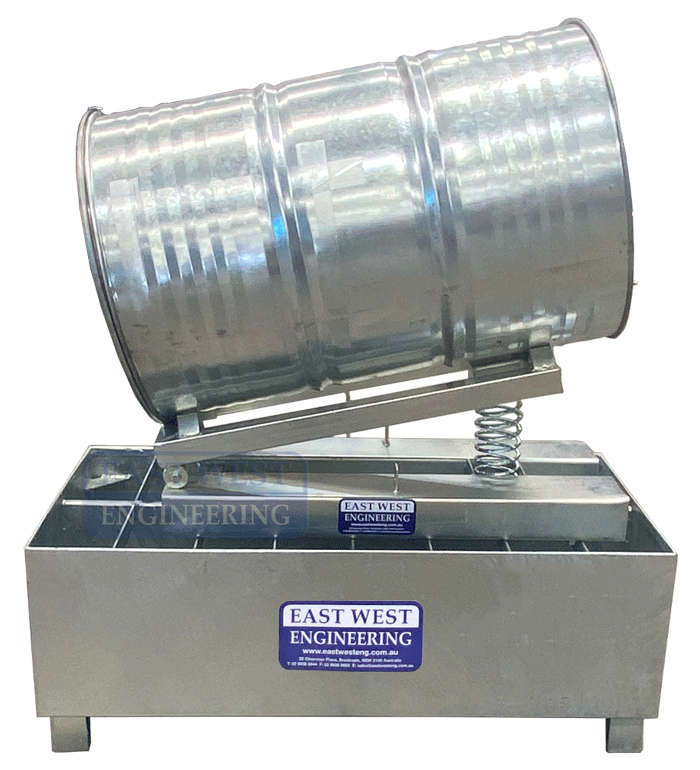 The RT-DRM Drum Tilting Spill Bin is designed to effortlessly allow discharge of liquid from a standard 205L drum while offering environmental protection against chemical spills. As the volume of liquid within the drum reduces, the spring mechanism of the tilter raises the rear of the container to an incline of up to 10°.