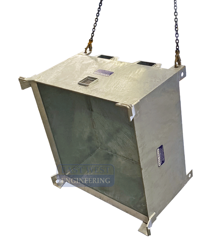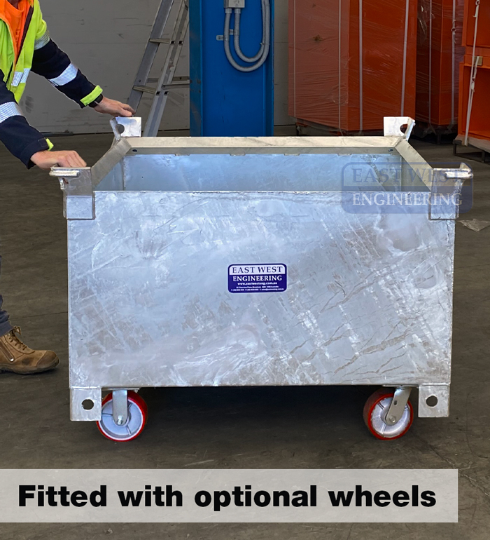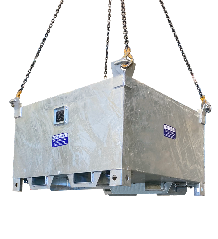 • Fork pockets fitted for transport around site or load can be emptied by a forklift fitted with rotator