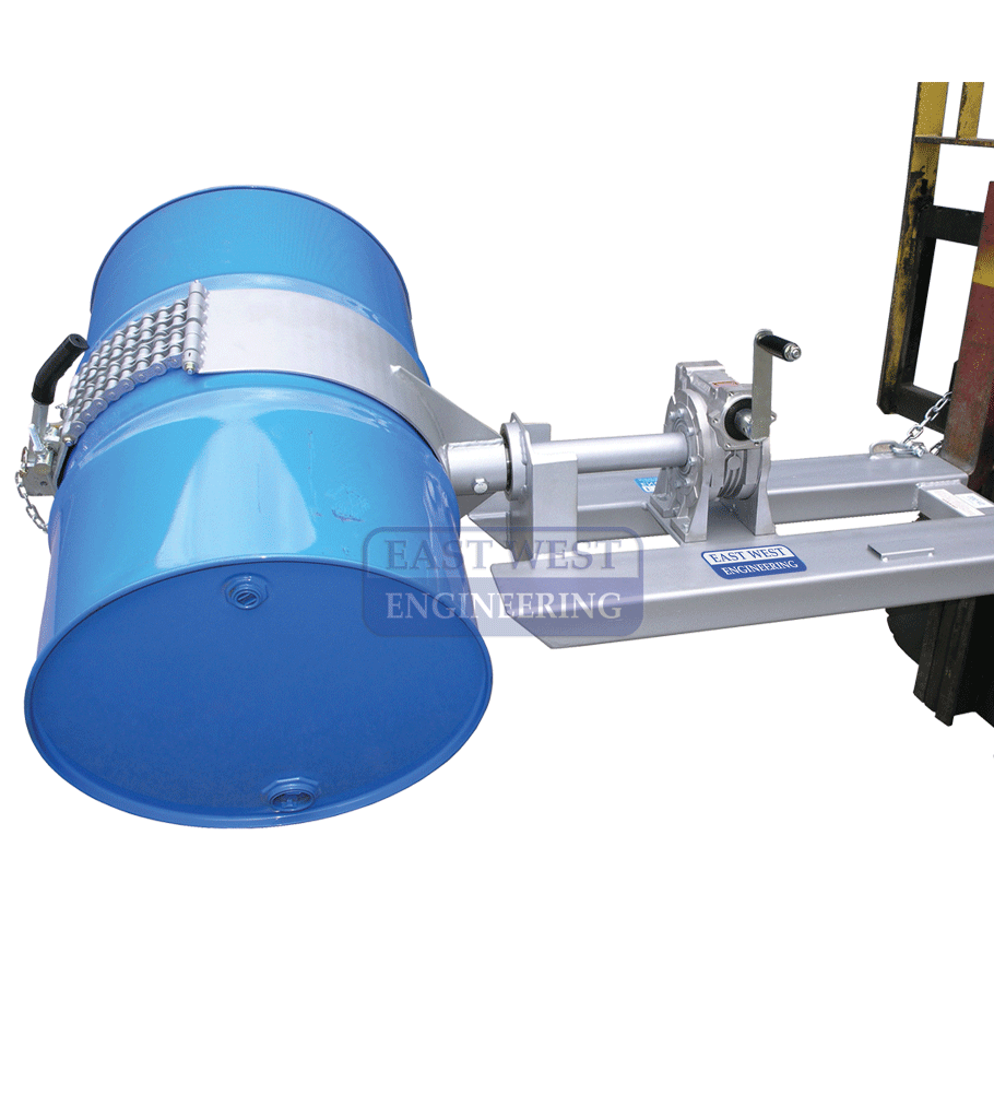 FEATURES: • Empties a standard 205 litre drum with minimal effort • Hand wheel is used to rotate the drum, ideal for lowered loads • Gearbox allows full control of rotation • Belly strap and eccentric lock secures drum in position • Slip-on attachment allows quick connection to a narrow carriage forklift • Can be coupled with the PBO Plastic Barrel Option • Enamel paint finish
